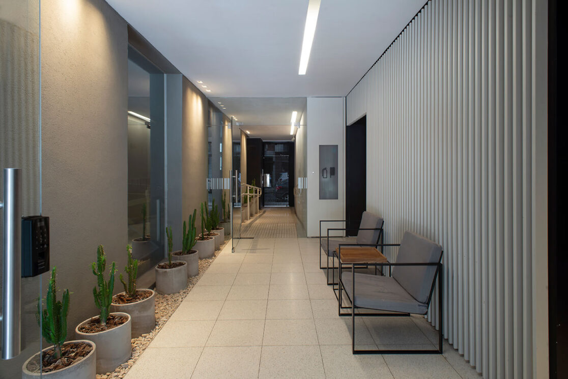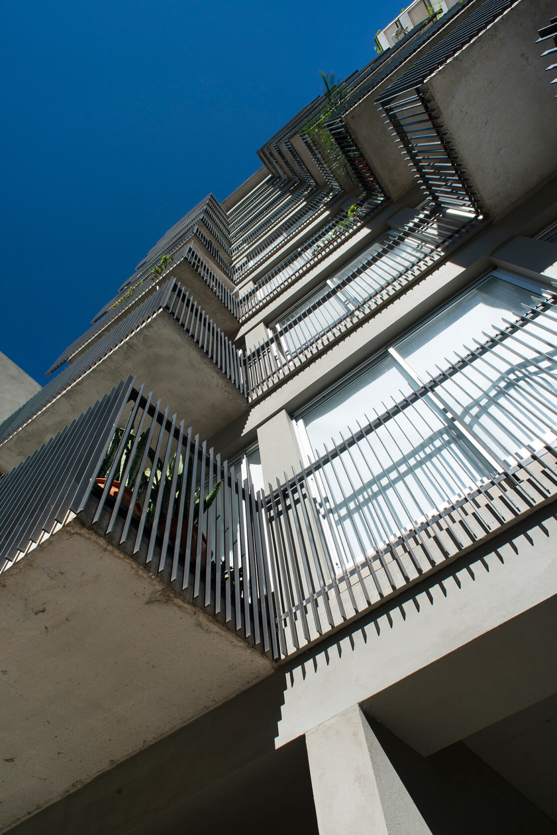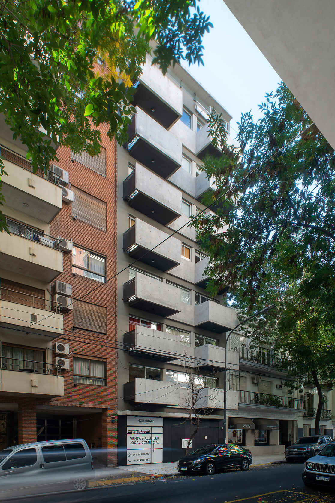 Ubicado en el barrio de Belgrano, este edificio de viviendas se desarrolla en altura con cuatro unidades por piso. En un lote típico de la ciudad, con un frente de 8,66 m, las tipologías de resuelven de manera simple priorizando la calidad espacial, la luz, las visuales y la relación con el barrio.